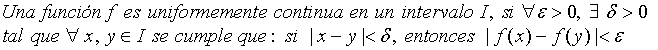 este apartado encontrarás fundamentalmente el teorema que asegura que toda función continua en un intervalo cerrado [a,b] es integrable sobre [a,b]. Para la demostración de este teorema, necesitamos algunos conceptos y resultados previos sobre continuidad y continuidad uniforme, que también serán incluidos. En realidad, es un teorema fácil de aceptar, pero si gustas formalizarlo, aquí tienes esta sección.